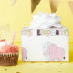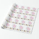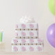 Papel de enrolamento com um padrão de elefantes cor-de-rosa e azuis, com a palavra "elefantes" impressa por baixo. Perfeito por embrulhar um presente de chá de fraldas!