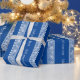 Papel de papel de embrulho azul do teste padrão chave grego do meandro. Adicione seus próprios nome e mensagem personalizados dos cumprimentos. Surpreenda seus amigos e família. Apropriado para mulheres e miúdos dos homens. Design de trabalho geométrico elegante da arte da fricção. Faça seu próprio papel de embrulho para wedding, feriados do Natal, chá de fraldas, graduação, ocasiões congratulatório, aniversário, aniversário, casa nova, casamento, reunions de família, gravidez, trabalho novo, restaurante, empresa e mais. Disponível nos rolos matte e lustrosos. Acessórios do divertimento DIY e fontes de empacotamento do partido.