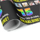 Esta animada e divertida design de papel embrulhado com tema de aniversário apresenta um grande número de "15", tendo um vibrante espectro multicolorido do arco-íris inspirado num padrão de gradiente, além da mensagem "Feliz 15 de Aniversário", e um nome de destinatário personalizado. Há também fotos que podem ser personalizadas, talvez com fotos do receptor, da família e dos amigos do destinatário e/ou do(s) remetente(s) do presente. Um papel de enrolar como este pode ser usado ao embrulhar presentes que são dados a alguém em comemoração de seu décimo quinto aniversário. (Fotografia © Storytree Studios, Stanford, CA.) [~Z0000670]