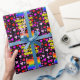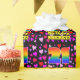 This joyful and colorful birthday wrapping paper design features a large number “21” having a rainbow spectrum gradient inspired pattern. It also features the message “Happy 21st Birthday,”, and a personalized name. The background features a pattern of heart shapes with colors like purple, red, and pink. Birthday themed wrapping paper like this might be used when giving a gift or present in celebration of somebody’s twenty first birthday. [~Z0000549]