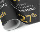 Este elegante e luxuoso design de papel de embrulho com tema de aniversário apresenta a mensagem "HAPPY 27th BIRTHDAY", um nome editável, e o número de aniversário "27th" com um padrão de aparência inspirado em falsa/imitação de ouro. O fundo é preto colorido. Um papel de embrulho como este pode ser usado na preparação de presentes ou presentes para comemorar o 27.º aniversário de alguém. [~Z0000454]