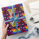 This colorful and happy birthday themed wrapping paper design features a large number “74” with a rainbow spectrum gradient inspired pattern, along with the message “Happy 74th Birthday,”, and a custom name. The background features a pattern of heart shapes with colors like pink, purple, and red. Birthday themed wrapping paper like this might be a fun way to wrap a gift or present being given to celebrate somebody’s seventy fourth birthday. [~Z0000549]