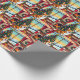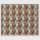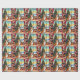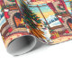 An adorable Christmas gift wrap with a festive Corgi sitting in front of the fireplace on a cold winter day. A Christmas tree decorated and a festive background.