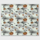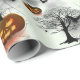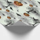 Design de Halloween vibrante que apresenta uma abóbora brilhante com olhos brilhantes e dentes numa paisagem escura com árvores e ravens.
