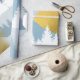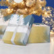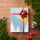 Uma bela design que mostra uma floresta coberta de neve, paisagem de montanha e um pôr do sol ou nascer do sol ouro refletindo na água. Os tons coloridos incluem tons neutros, como azul, branco e ouro. Um design rústico ideal para decoração caseira de inverno e estação festiva de férias.