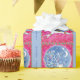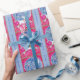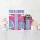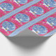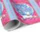 A imagem retrorreflectora abstrato neste papel de embrulho de presente de Natal é única. Ele apresenta uma rena prateada bonito vestida de verde e vermelho, e com uma variedade de bolbos coloridos de Natal pendurados em suas enormes galhadas. O veado se apresenta antes de um céu azul circular noturno completo com lua crescente e estrelas. A imagem é colocada sobre um fundo cor-de-rosa claro bordado em azul correspondente. O texto "Feliz Natal!" está na fronteira azul.