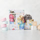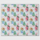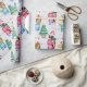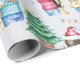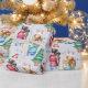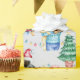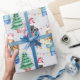 Este doce papel de embrulho é perfeito para qualquer presente de Natal. Um fundo de cinzas leves com crianças vestidas em chapéus de Papai Noel segurando diferentes cachorros, e árvores de Natal por toda parte.
