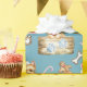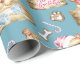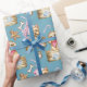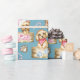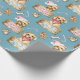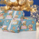 Estes filhotes adoráveis querem desejar aos seus amigos e família um Feliz Natal! Um fundo azul bebê com filhotes adoráveis segurando placas que dizem "Feliz Natal" e pequenas pegadas. Biscoitos de gengibre, canas doces e ossos de cachorro espalhados.
