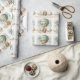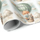"Adventure Awaits" themed baby shower wrapping paper with an adorable fox holding a teddy bear riding in a green hot air balloon. The watercolor green sky has white clouds with surrounding gold stars.
