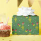 Saudações da temporada, terráqueos! Este festivo papel de embrulho de Natal traz ilustrações de pequenos homens verdes vestindo chapéus vermelhos de Papai Noel com alguns ornamentos do globo de férias que se parecem com planetas com estrelas brancas sobre um fundo verde.
