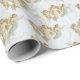 Um trio de crianças anjos segurando as mãos em um fundo azul-ornamentado e ouro coberto de pergaminhos.