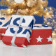 Comemorando o aniversário de 250 anos dos EUA. Este papel de embrulho vermelho, branco e azul tem a palavra 'EUA' no centro. Os anos 1776 e 2026 estão ao lado de EUA. A faixa superior é azul e tem estrelas brancas. A faixa do centro é branca. A faixa inferior é vermelha com estrelas brancas.