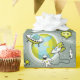 Papel de embrulho de aniversário cinza, verde e amarelo para crianças viajantes espaciais projetado com planetas, cometas e astronautas
