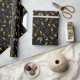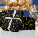 Papel de embrulho belamente desenhado, com um padrão festivo de garrafas de vinho, óculos, fogos de artifício, sagrados e bagas contra fundo preto.