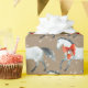 Papel de embrulho de inverno que inclui cavalos brancos pintados a aquarelas com grandes arcos de férias de veludo vermelho sob uma poeira de neve, segundo um padrão repetido num papel de embrulho Kraft a cores.