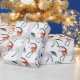 Papel de embrulho de inverno que inclui cavalos brancos pintados a aquarelas com grandes arcos de férias de veludo vermelho sob uma poeira de neve, segundo um padrão repetido num papel de embrulho branco.