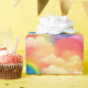 Padrões brilhantes e coloridos apresentam arco-íris arqueando sobre nuvens lisas contra um céu vibrante. O motivo repetido cria um pano de fundo caprichoso e alegre.