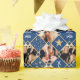 Enrole seu presente no estilo Art Deco com este pacote personalizado de presentes de fotos! Um padrão geométrico sem costura, com formas de diamante, estrelas e tipografia de na moda. Personalize o modelo com três fotos favoritas, o nome do receptor e a idade de aniversário. Uma forma única e luxuosa de celebrar um aniversário especial para a família e os amigos! Cores impressas: azul, branco e ouro. Disponível com a opção de um acabamento mate ou brilhante.