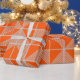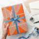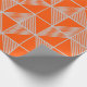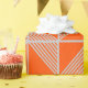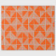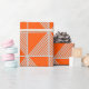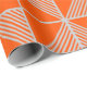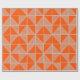 Este papel de embrulho tem um design de quadrados de arte deco dividido em metade por linhas diagonais de prata. Os quadrados são então reunidos num campo de laranja.