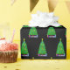 Esta design apresenta representações de uma árvore de Natal decorada com uma estrela em cima e presentes embaixo dela.