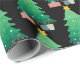 Este papel de embrulho de presente de Natal apresenta um gráfico caprichoso e festivo de uma árvore de Natal decorada, acentuada com presentes. O fundo é preto para dar um contraste ousado.