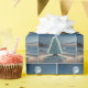 Uma árvore de Natal de vidro marinho fica na praia sob a lua brilhante de cheio, com estrelas brilhando no céu noturno enquanto ondas suaves se chocam contra a costa
