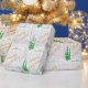 Este papel de embrulho de presente de Natal apresenta um gráfico de três árvores de Natal decoradas, altas e esbranquiçadas, sobre um fundo de bronzeado/cinza acentuado com um padrão de flocos de neve. Texto personalizável Dourado e verde: Feliz Natal de (SEU NOME).