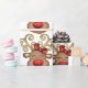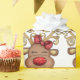 Uma ilustração maravilhosa da cabeça de uma rena de desenho animado vestindo um arco vermelho brilhante em seus chifres tem um nariz vermelho brilhante e vermelho brilhante e cornos dourados falsos. Ela é colocada contra um fundo branco que a faz pop. Este presente trará um pouco de diversão e elegância aos seus presentes de Natal nesta época festiva.