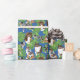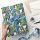 Ilustrações bonitas e realistas de cães pastores australianos ou Aussies e folhas tropicais brilhantes e verdes de monstera são colocadas sobre um fundo azul real neste plástico de presente, qualquer ocasião com formato padronizado.