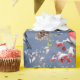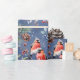 Um papel de embalagem de férias com aquarelas pintadas de pássaros-touro Eurasiáticos, que se banham de bagas vermelhas e azuis com pínus cones e ramificações, segundo um padrão repetido, em fundo azul-ombre.