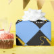 Embalagem para presente de graduação para o formando com boné preto clássico com fita de ouro sobre fundo azul-claro. Editar texto para adicionar o nome do formando.
