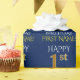 Este design de papel de embrulho apresenta uma mensagem como "primeiro aniversario FELIZ", com as "1ruas" com aparência falsa/de ouro imitado. Também apresenta um nome personalizado e um fundo de cor azul. Talvez possa ser utilizado quando se trata de embrulhar presentes para o primeiro aniversário de alguém. [~Z0000135]