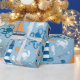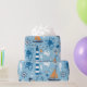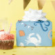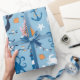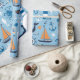 Design de tema oceânico e náutico inclui baleias, veleiros cor de laranja, polvo, caranguejos, cavalos do mar, rodas de navios, âncoras, faróis e muito mais sobre um fundo azul-claro bonito.