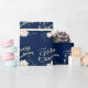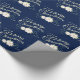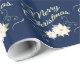 Este papel de embrulho apresenta um gráfico digital inspirado em vintage de poinsettias brancas sobre um fundo azul-marinho escuro. O texto do roteiro num gradiente dourado diz: Feliz Natal.