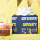 Este design de papel de embrulho apresenta uma mensagem como "ANDREW'S 53rd BIRTHDAY!", com o "53º" a ter uma aparência falsa/imitada de cor dourada, e com o nome e "BIRTHDAY" numa fonte divertida e ousada. O nome é personalizável e o fundo tem cor azul. Um papel de embrulho como este poderia talvez ser usado para embrulhar presentes de aniversário que são dados a alguém em comemoração de seus cinquenta e três anos de aniversário. [~Z0000209]