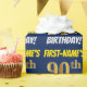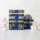 Este design de papel de embrulho apresenta uma mensagem como "PRIMEIRO NOME DO 90 DE ANIVERSÁRIO!", com o "90" a ter uma aparência falsa/imitada de cor dourada, e com o nome e "ANIVERSÁRIO" numa letra divertida e ousada. O nome pode ser personalizado, e o fundo tem cor azul. Um papel de embrulho como este poderia talvez ser usado para embrulhar presentes de aniversário que são dados a alguém em comemoração de seu nonagésimo aniversário. [~Z0000209]