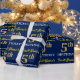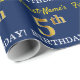 Este design de papel de embrulho apresenta uma mensagem como "First-Name’s 5 BIRTHDAY!", com o "5" a ter uma aparência falsa/de cor dourada. O nome pode ser personalizado, e o fundo tem cor azul. Talvez possa ser utilizado quando se trata de embrulhar presentes para o quinto aniversário de alguém. [~Z0000181]