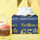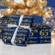 Este design de papel de embrulho apresenta uma mensagem como "FirstName’s 65th BIRTHDAY!", com o "65º" a ter uma aparência falsa/de cor dourada. O nome pode ser personalizado, e o fundo tem cor azul. Talvez possa ser utilizada quando se dá presentes para o sexagésimo quinto aniversário de alguém. [~Z0000181]