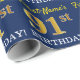 Este design de papel de embrulho apresenta uma mensagem como "First-Name’s 91rua BIRTHDAY!", com a "91ruas" a ter uma aparência falsa e imitada de cor dourada. O nome pode ser personalizado e o plano de fundo tem cor azul. Talvez possa ser utilizado quando se dá presentes para o nonagésimo primeiro aniversário de alguém. [~Z0000181]