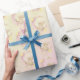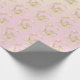 Elefante bebê bonito sentado em uma lua crescente com flores, estrelas e brilho dourado sobre fundo de gradiente rosa e amarelo.