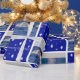 Papel de envolvimento impressionante do Natal que caracteriza diversos tiros de uma baleia que rompe, lançando seu corpo maciço inteiro fora da água, na frente da skyline bonita do paraíso dos surfistas de Austrália. Todos os anos os milhares de baleias migram para o norte da Antártica ao longo do litoral australiano para dar o nascimento a suas vitelas e raça.