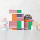 Papel de embrulhamento de pisos IRLANDÊS AMERICANOS. PAPEL IRISH AMERICAN WRAPPING, na moda e patriótico, mostrando o FLAG IRLANDÊS e o FLAG dos EUA em um padrão de títulos. Presença ideal para o MÊS DO PATRIMÔNIO IRLANDÊS AMERICANO e celebrações de Dia de São Patrício.
