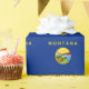 Dentro do selo, de um arado, da pá, e do resto da picareta em um campo na frente de Great Falls do Rio Missouri. A fita contem a divisa do estado, plata de Oro y (espanhol para o "ouro e a prata"). A bandeira atual foi adotada em 1905, e a palavra "Montana" acima do selo foi adicionada em 1981. Em 1985, a bandeira foi alterada outra vez para especificar a pia batismal usada em "Montana: " Corajoso Helvética. Antes que estêve adotada como uma bandeira do estado, foi usada pelas tropas de Montana que distribuem para guerra espanhola/americana.