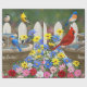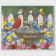 Um primavera de pássaros coloridos e flores em volta de um bonito banho de pássaros.