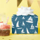 Barcos-vela brancos em papel de enrolamento náutico azul profundo. Folha azul-presente de marinho divertido impressa com barcos à vela brancos e iates. Belo plástico náutico para presentes.