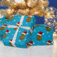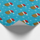 Repetir padrão de uma batata feliz de Natal em um chapéu de Papai Noel. Fundo azul com flocos de neve brancos.