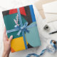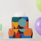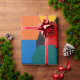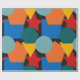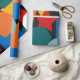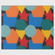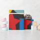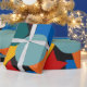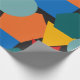 Este papel de embrulho tem um design Bauhaus de formas aleatórias em azul, lacre, amarelo, vermelho e laranja.