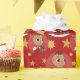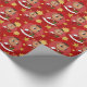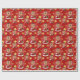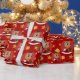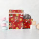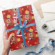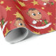 Papel de embrulho de Natal com ilustração de um bebê hispânico/latino sorridente com um presente de Natal; num círculo vermelho sobre fundo vermelho, um design de Natal com um modelo de texto editável para o seu nome ou mensagem