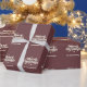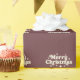 Um fundo castanho de café mudo, texto colorido creme. Feliz Natal é escrito com uma fonte retrô do estilo 70. Personalize e adicione seu nome de família.