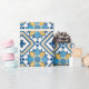 Adicione o charme costeiro mediterrânico aos seus presentes com este Marinho Azul Claro e Amarelo Azulejo Azulejo Floral Padrão Natal ou papel de embrulho de presente de aniversário para as suas necessidades de embrulho de presente. Inspirado pelos tradicionais azulejos Azulejo da Espanha e de Portugal, este papel de embalagem apresenta um intrincado padrão geométrico em azul-marinho e amarelo-ouro ensolarado